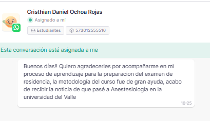 «Futuros Residentes muchas gracias por el enfoque tan completo que tienen, PNL, el apoyo psicológico, financiero y académico, he hecho muchos cursos en 5 años de preparación, pero este me impulso a mi sueño, pase a dermatología a la universidad de mis sueños. ¡Los llevo en el corazón, sí se puede!».