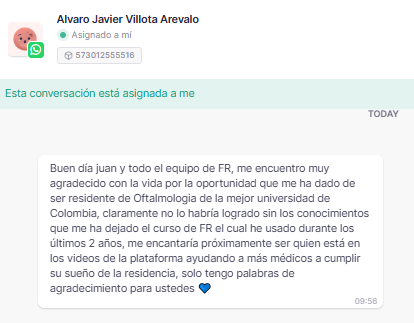 «Empecé con ustedes en el 2020 mientras vivía en Chile, me recomendaron muchísimo este curso, así que empecé a estudiar, en el 2021 regrese a Colombia, renuncie a mi trabajo y me dediqué solo a Futuros Residentes, ha sido la mejor decisión que he tomado, hoy puedo decir que soy R1 de ginecología y obstetricia en la UdeA y ustedes fueron parte fundamental de este proceso, no solo en la parte académica sino también en la parte emocional, muchas gracias, Futuros Residentes».