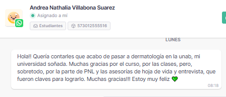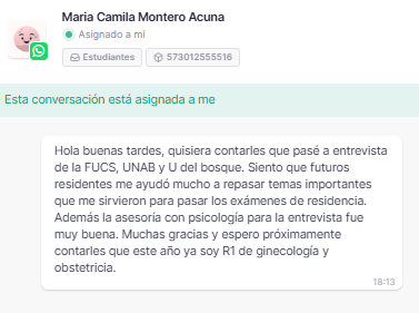 «Buenos días, quisiera agradecerles la asesoría y también los tips qué hay para preparación de entrevista y hoja de vida en la plataforma, los cuales me indicaron ver previamente a la asesoría, sin duda alguna fue la primera vez que me sentí tan bien en una entrevista y noté los errores que tenía en mi hoja de vida y cómo hacer para resaltar las cosas que después mis entrevistadores reconocieron. Quiero contarles que he sido admitida al programa de cirugía Plástica del CES y que sin duda alguna su colaboración en todas las etapas de la preparación fue esencial. Muchas gracias».