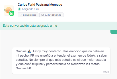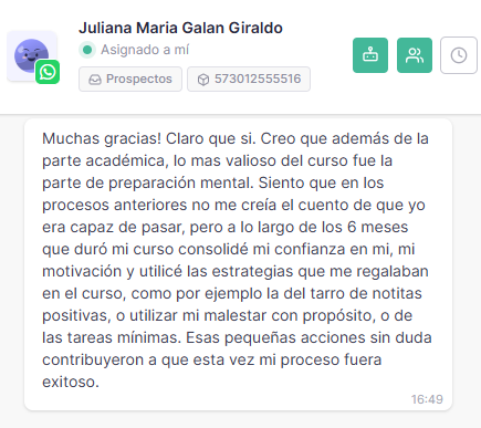 «¡SON LOS MEJORES! Definitivamente, fue la mejor decisión iniciar el proceso con ustedes. Sin duda alguna la preparación académica es excelente, pero lo que marca la diferencia es la preparación mental y la ayuda que da la PNL en todo el proceso. Desde el momento en que me creí que iba a pasar, sabía que solo era insistir y no desfallecer. Mil y mil gracias».