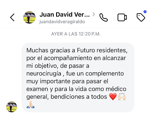 «Futuros residentes fue un curso de gran ayuda tanto en lo académico como en lo personal para ayudarme a cumplir el sueño de ser residente, hoy 20/05/22 cumplo el sueño de pasar a la universidad de Antioquia a anestesiología, quiero agradecerles por acompañarme en este proceso y lo recomiendo al 100%».