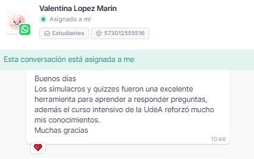«El curso muy bien estructurado tanto en la plataforma virtual como en la parte presencial; los simulacros son la mejor parte porque nos permite evaluar muchos elementos, no solo de conocimientos, sino de cómo abordar la pregunta o cómo interpretar los enunciados, lo que permite obtener herramientas necesarias para el examen».