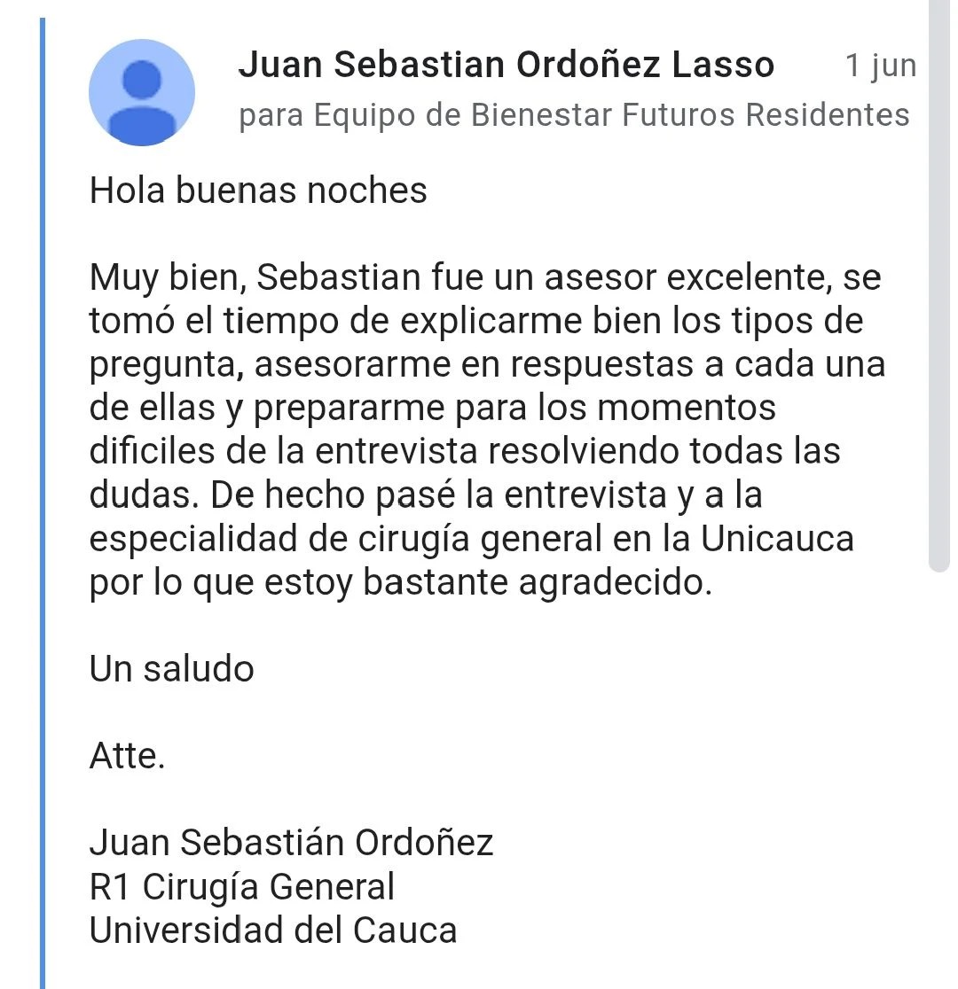«Hola, soy médica graduada desde hace 5 años de la ciudad de Barranquilla. Durante 4 años intenté presentarme a especialización sin éxito alguno. En la mayoría de las ocasiones pasé el examen, pero la entrevista siempre fue mi Talón de Aquiles, hasta tal punto de que era algo exasperante para mí. Decidí tomar una asesoría de entrevista con Futuros Residentes y me pareció una acertada decisión. El material disponible en la plataforma me ayudó a configurar una hoja y un perfil atractivo, al igual que la asesoría con psicología me ayudó a tener más confianza y a tener en cuenta todos los elementos que tenía a mi favor para con éxito lograr mi sueño».